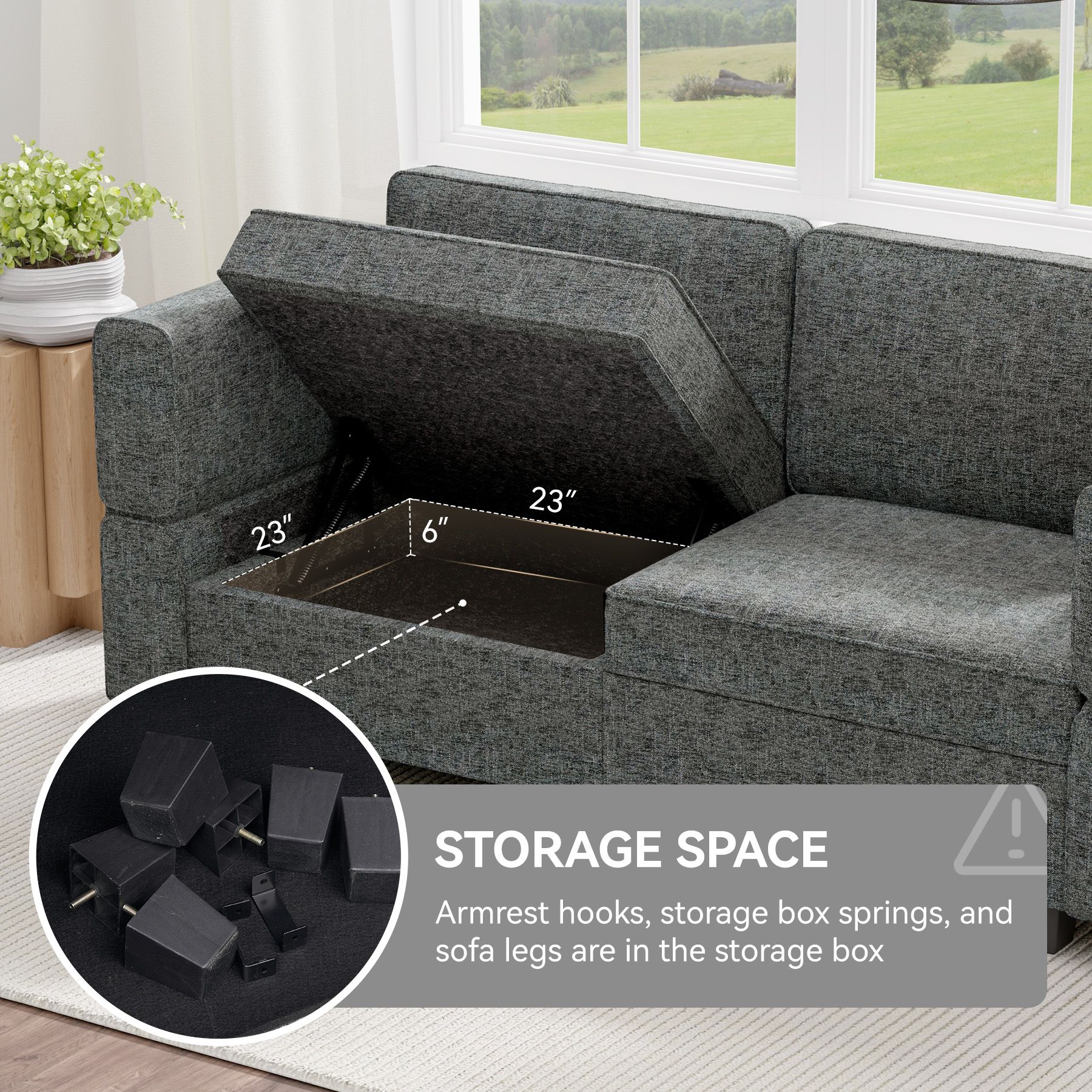 [Storage & Adjustable]There are storage spaces under each seat of modular sectional sofa couch,which offer a convenient place to neatly organize your belongings. Storage dimensions: 23''(L)*23''(W)"*6"(H). The adjustable armrests and backrest offer three reclining positions (up to 135°) to help you find the ideal sitting or resting angle to fully relax your body and relieve fatigue.