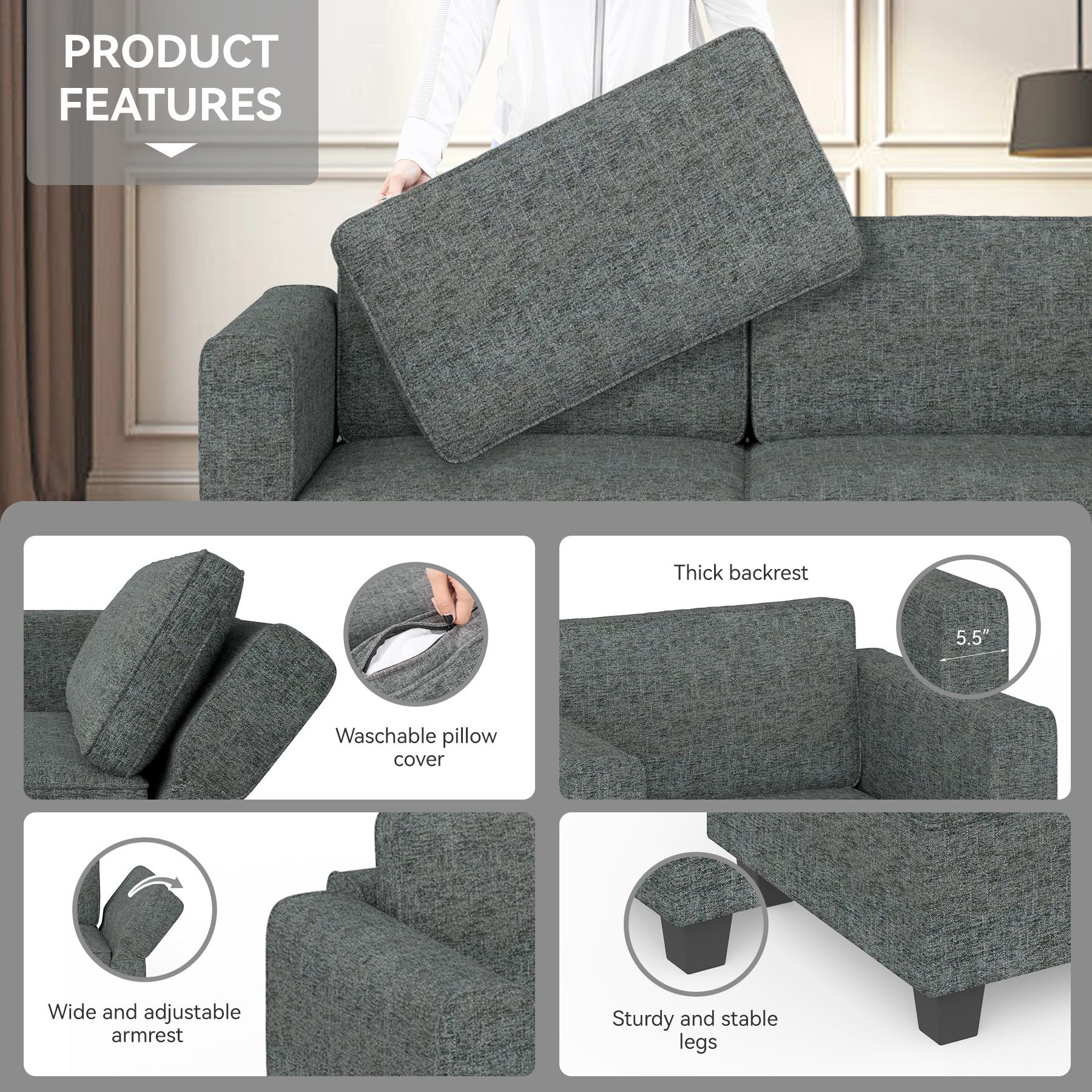 [Enhanced Comfort] Indulge in a luxurious seating experience with our thickened padded seat cushion which is filled with premium foam and advanced spring padding . The specially thickened back pillows and high quality cotton filling allow you to enjoy extraordinary comfort. While the soft and breathable linen fabric provides the ultimate tactile experience. Our sofa also boasts swift rebounding capabilities and exceptional durability, ensuring long-lasting comfort and support with every use.